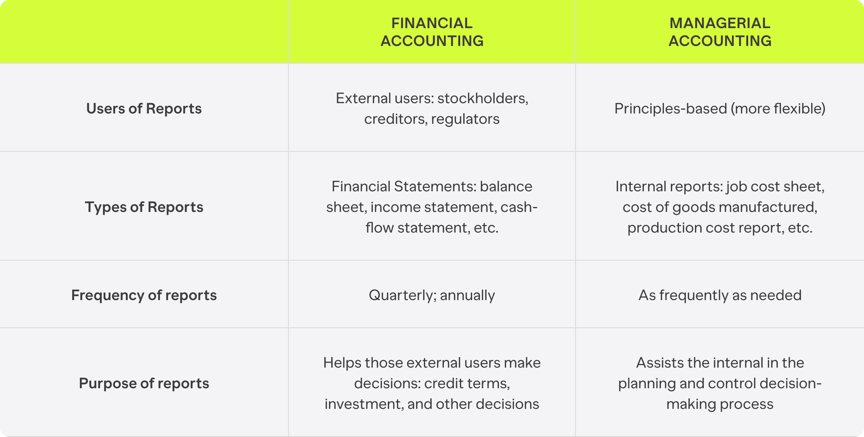 These differences highlight how financial and managerial accounting serve unique but complementary roles in a business's financial ecosystem.